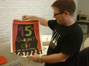 I per tot això ara era el moment de fer-nos una foto tots junts amb la famosa mà de l'estudi (la que apareix a la seva web) i obsequiar-los amb una serigrafia de la darrera campanya del festival “Guanya't el cel”, feta per l'il·lustrador Daniel Torres.